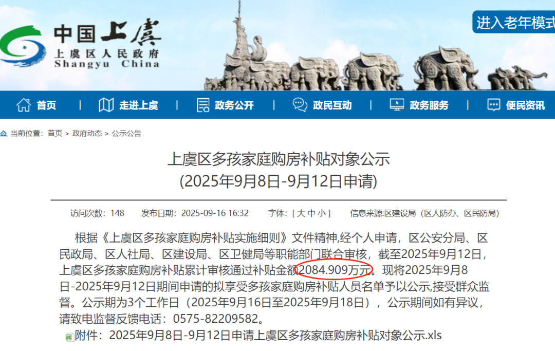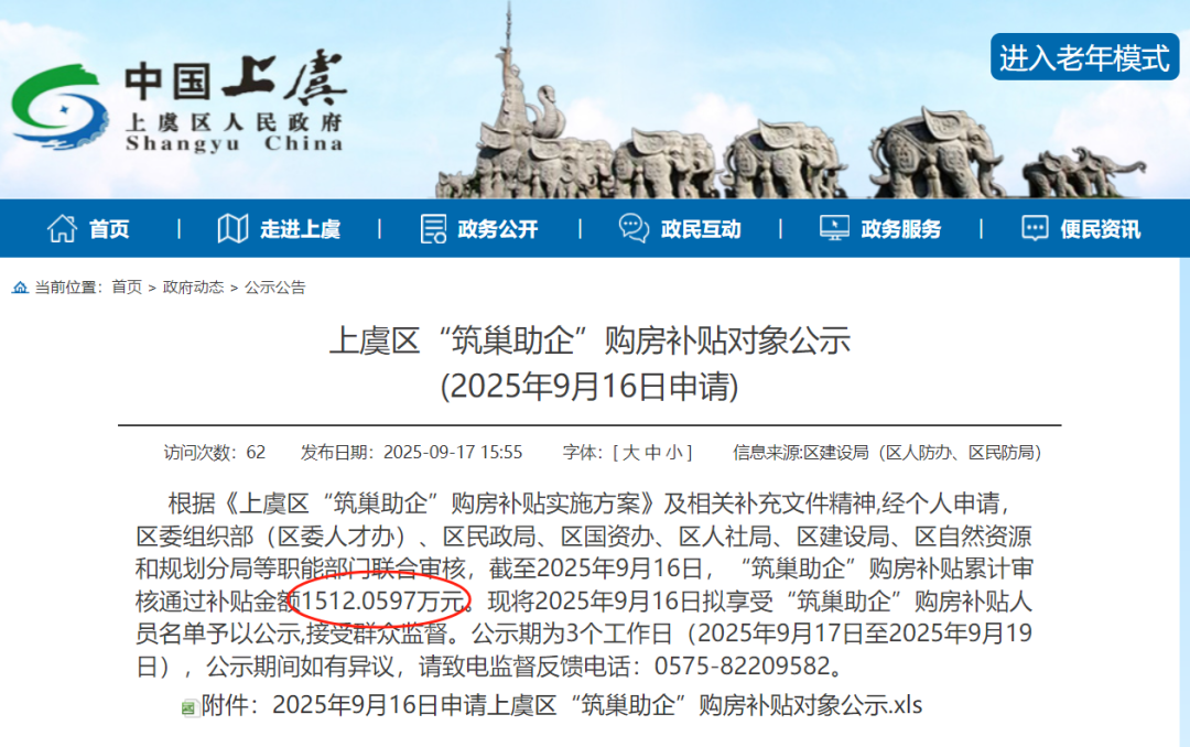 据官方发布的《上虞区“筑巢助企”购房补贴对象公示》,截至2025年9月16日,累计审核通过补贴金额1512.0597万元。